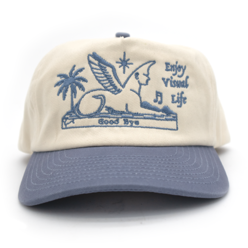 'Enjoy Visual Life' embroidered on off white cap with slate blue thread.